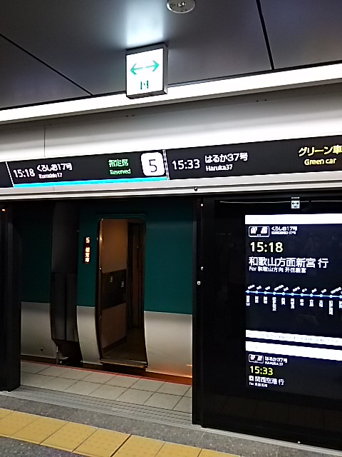 | | 「和歌山方面新宮行」の「特急くろしお号」が大阪駅うめきたホーム21番乗り場の到着し、ホームドアと電車の扉が開いているところを撮影。 |