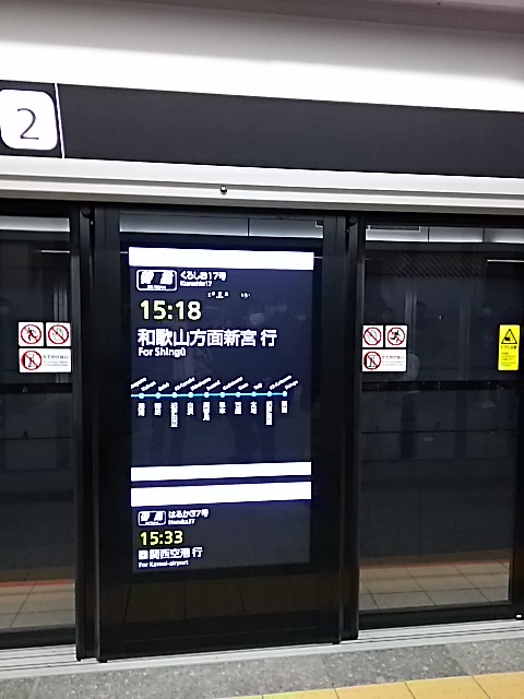 | | 地下ホームに到着。乗り場は21番~24番までありますが、「和歌山・関西空港」に向けて発車する21番乗り場のフルスクリーンを撮影。 |